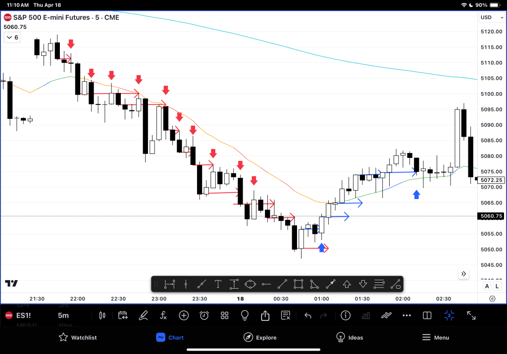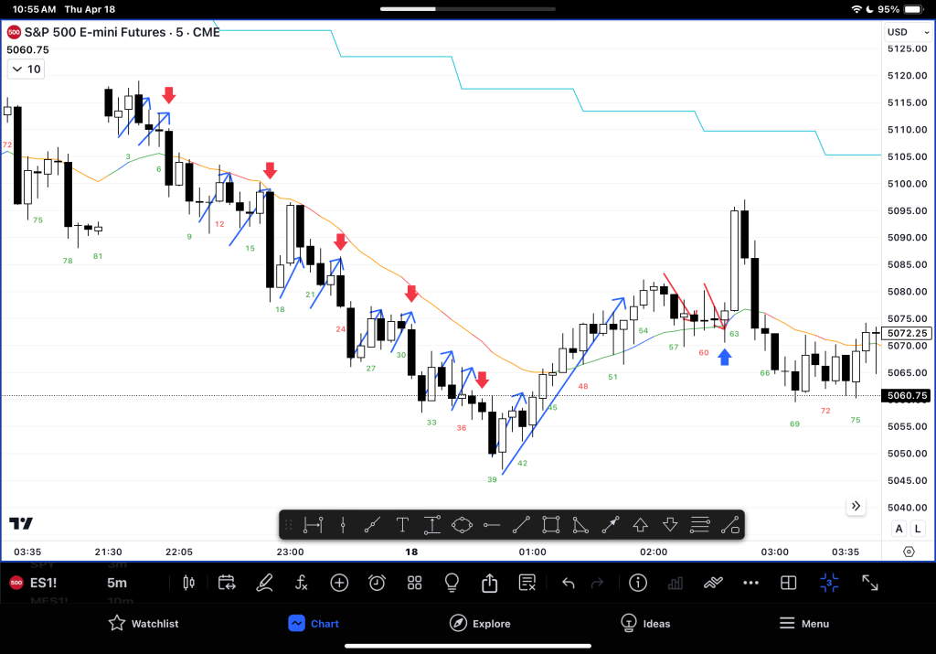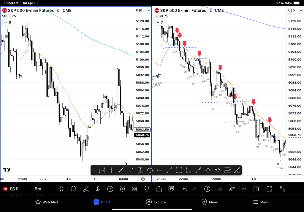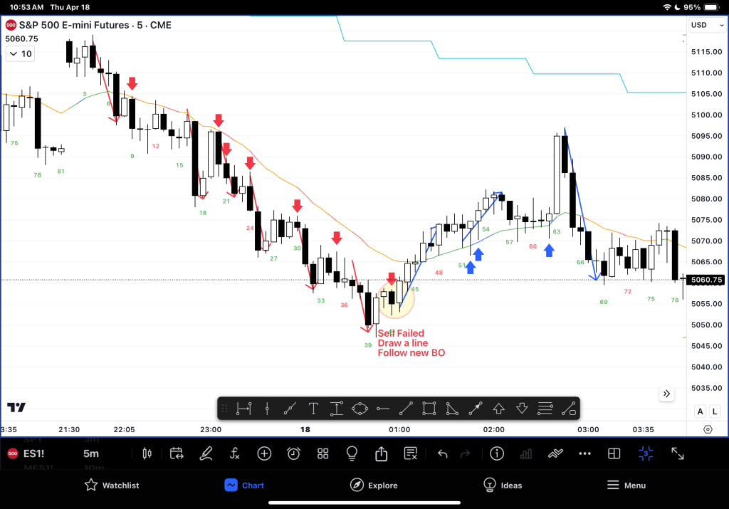 – Reduce the timeframe to 2min (turn into a wider channel to see gaps / BO point tests. Yesterday gaps were decreasing and then increased again! So watching gaps is a valuable strategy
