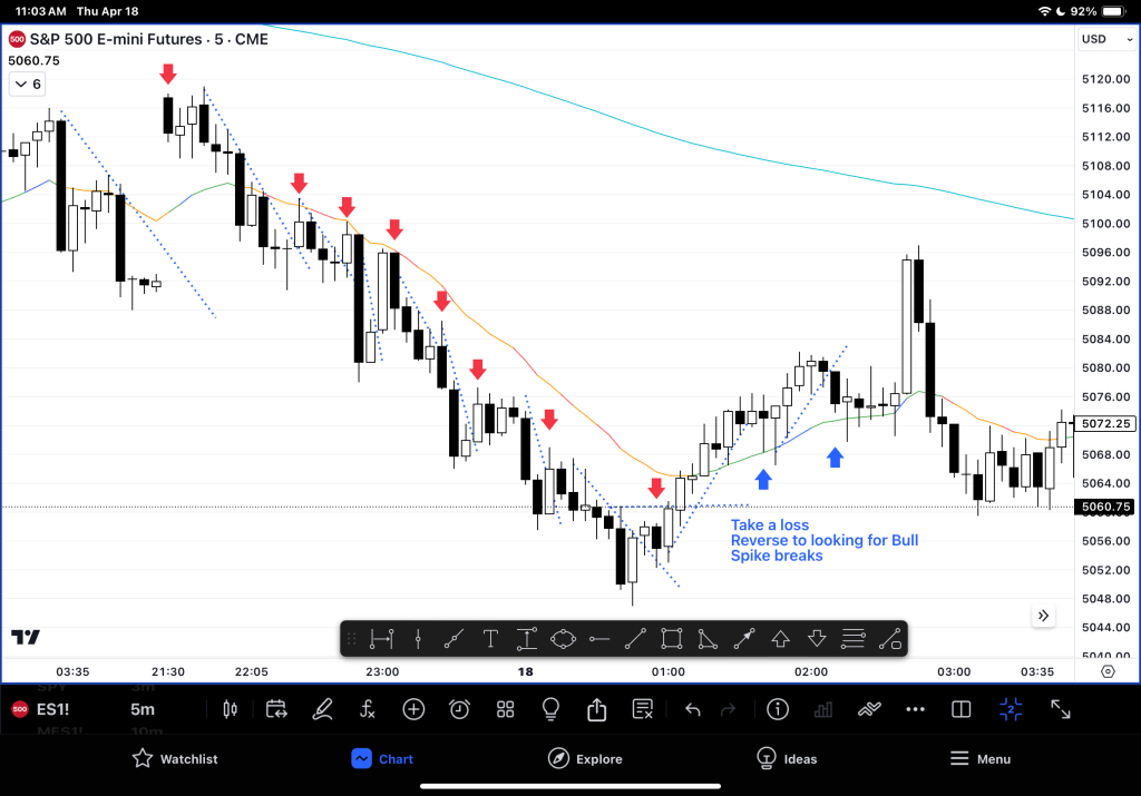 – Trade spike breaks (test back to the BO point of a tight channel. This means a trader could have sold at the break and higher and made money until the trend ended – which is where you have to take a loss and switch – recovering your loss and making a profit on your final long trade.