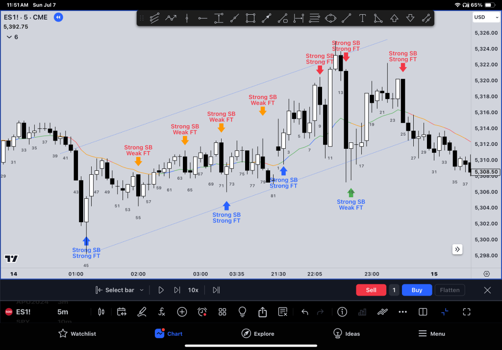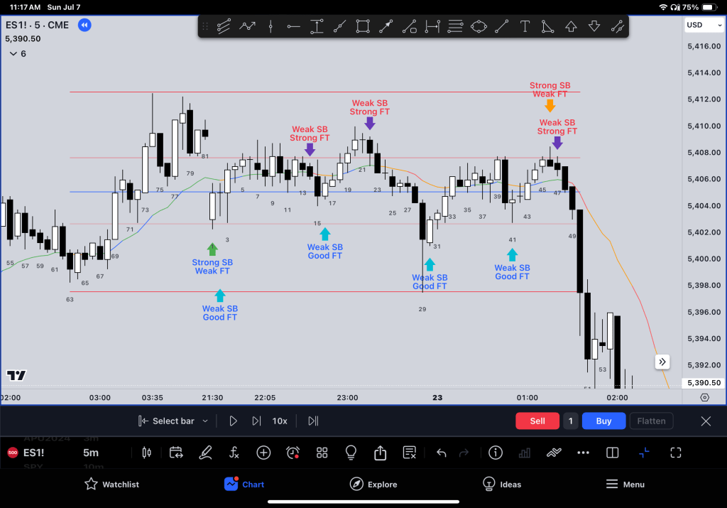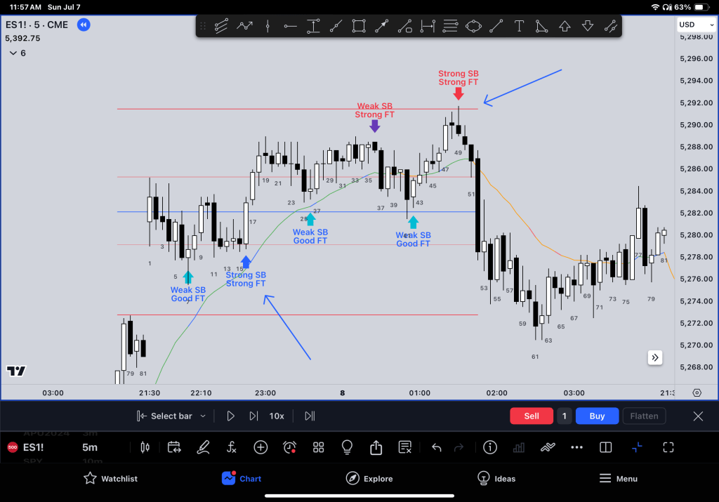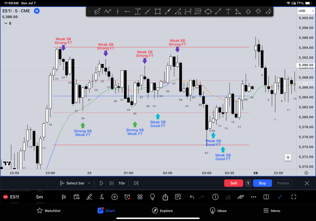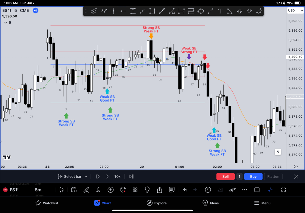 This review focuses on the follow-through bar (FT) and market trends. It identifies if the market is in a trend or trading range.