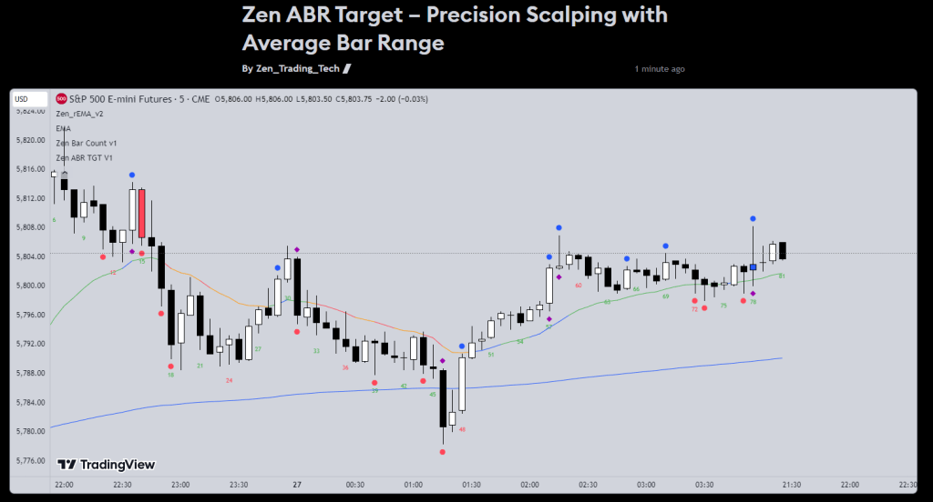 If you’re looking to improve your scalping strategy, the Zen ABR Target is the perfect tool. Designed for TradingView, this indicator uses the Average Bar Range (ABR) to assess if the next bar meets the target, helping you gauge market momentum and identify potential trading ranges.
