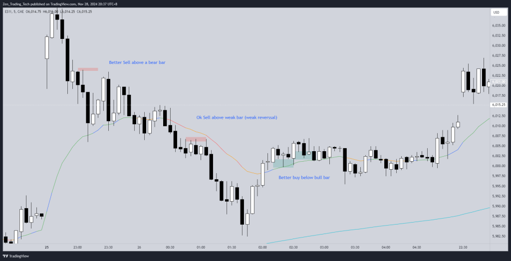 - Often, the best entries occur above a bear bar or below a bull bar, signalling failed reversal attempts.