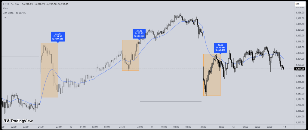This indicator highlights the first 18 bars with a visual box and shows the range as a label. That’s it. But that simple visual aid can change how you study the open.