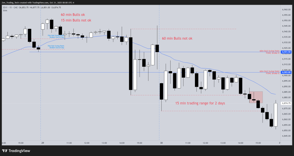 - 15 minute chart we broke a swing point at the end of the prior day and GAP UP broke another – so 15 minute Bull trend of trading range