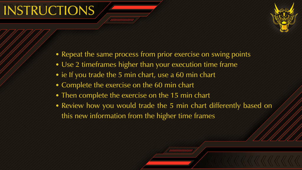 The second practice drill is HIGHER TIME FRAME (HTF) SWING POINTS — “seeing the battle from the mountain.”