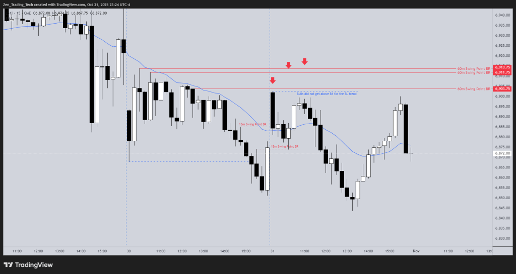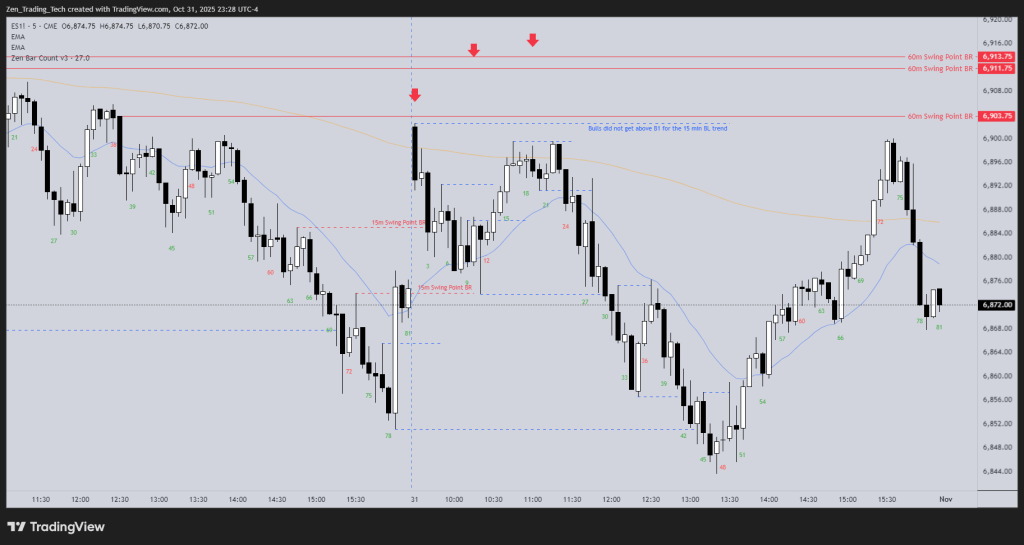 This lesson walks through session preparation using multi-time-frame awareness — how the 15-minute and 60-minute charts guide the reading of swing points on the 5-minute battlefield.