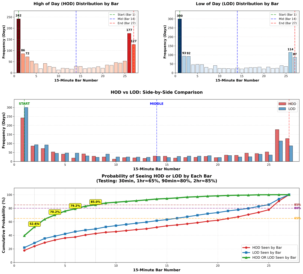- By bar 6 on the 15 min chart (90 minutes into the session), 79% chance we’ve seen the high or low of the day. Thats an edge.