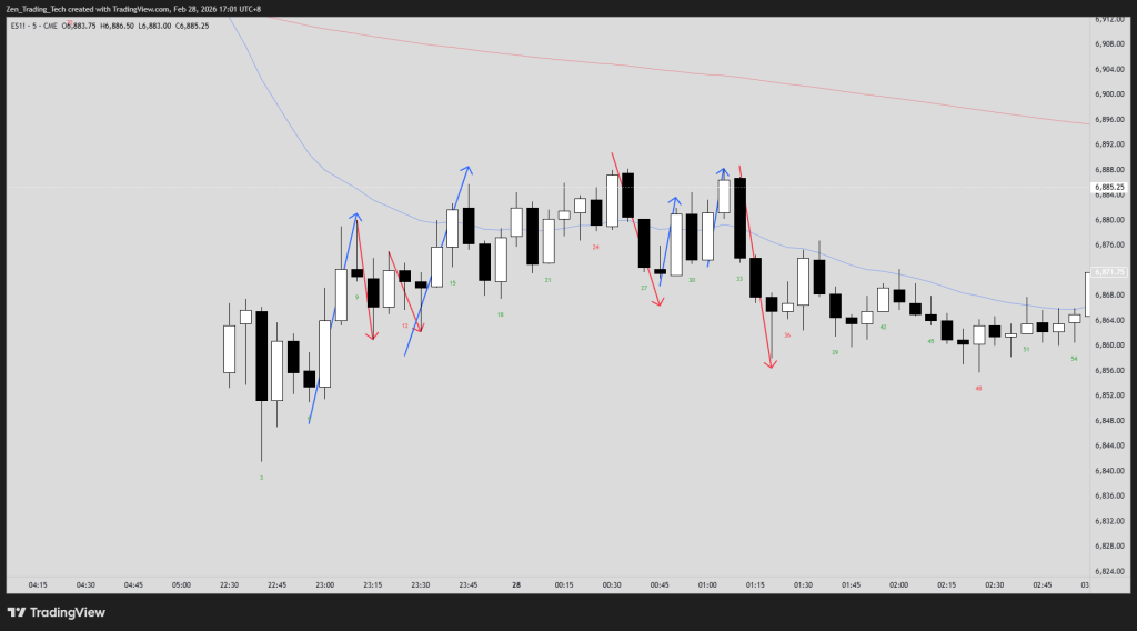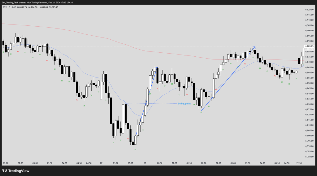 Homework: On yesterday’s chart, where was the counter-trend move so strong that an MTR was the better read? Where would you have switched from swinging to scalping?
