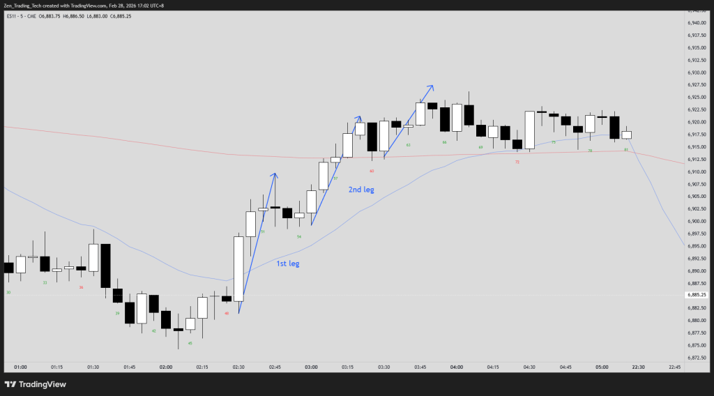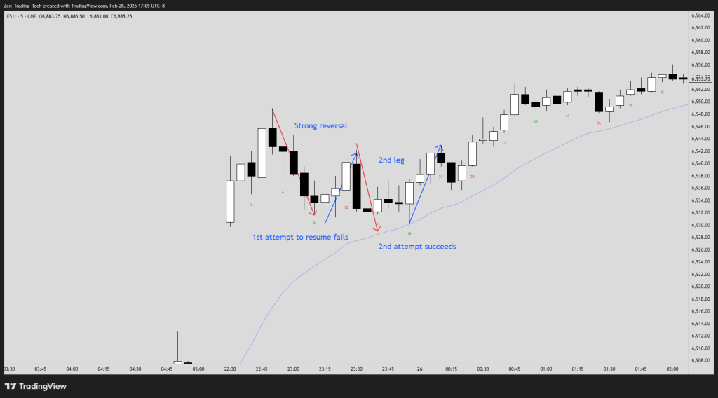 This is the one that catches people off guard. You’re in a trend, and a pullback starts. The instinct is to assume it’s a one-bar or two-bar dip and immediately look to re-enter. But most pullbacks have two small counter-trend legs before the trend resumes.