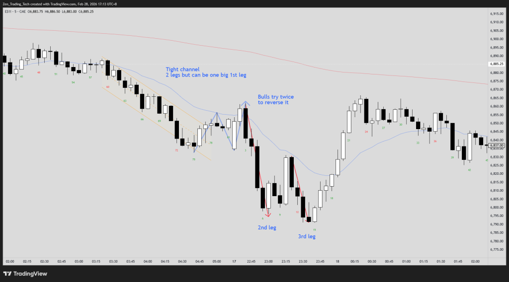 Here’s a subtle one. You see two legs in the same direction, but they’re in a tight channel (TC) — no trendline break yet, bars are orderly, pullbacks are small. When this happens, those two legs together might be a first leg of a larger move.